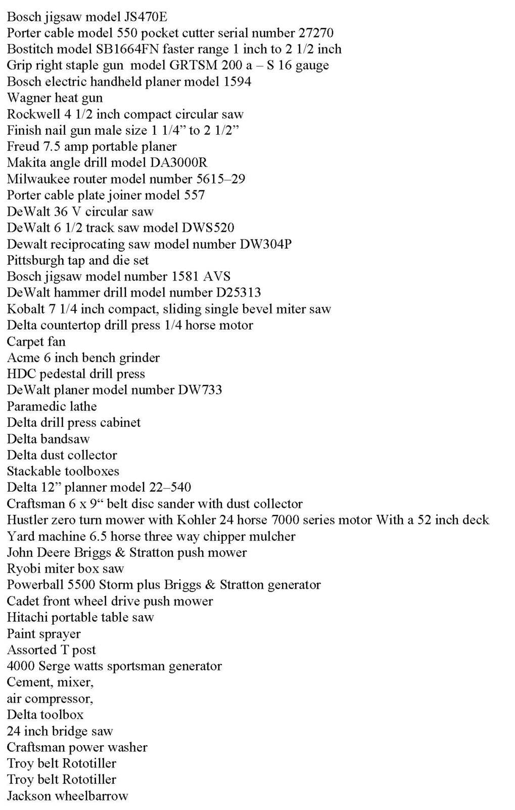 Tool and Firearm list so far, many other items and supplies - Information is subject to correction and announcements day of sale.