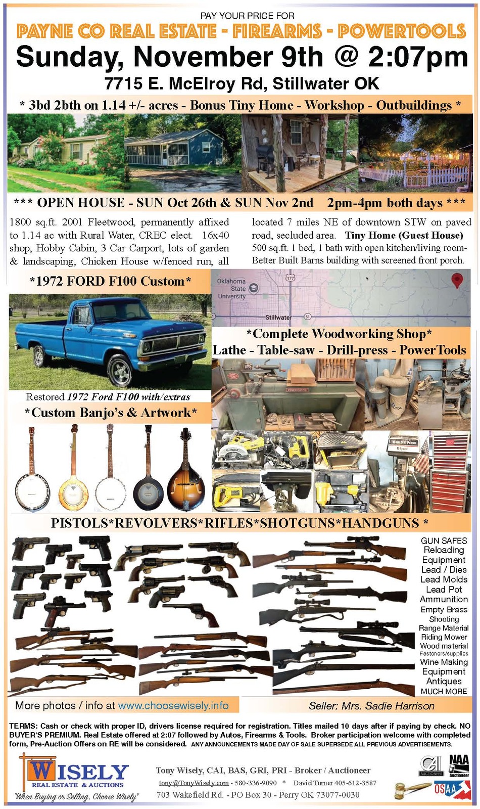 AUCTION SUNDAY NOVEMBER 9th @ 2:07pm Real Estate - 1972 Ford - Firearms - full Woodshop Tools/Materials - Banjos 1800sq.ft. 3Bd 2 Bath on 1.14 acres NE of Stillwater w/ 1bed / 1bath Tiny Home (guest home or small business location) 16'x40' Shop, he/she shed hobby Cabin, 3 Car Carport, Rural Water, CREC, on Paved Road 7 Miles NE of Downtown STW . . . MUCH MUCH MORE . . SEE BELOW